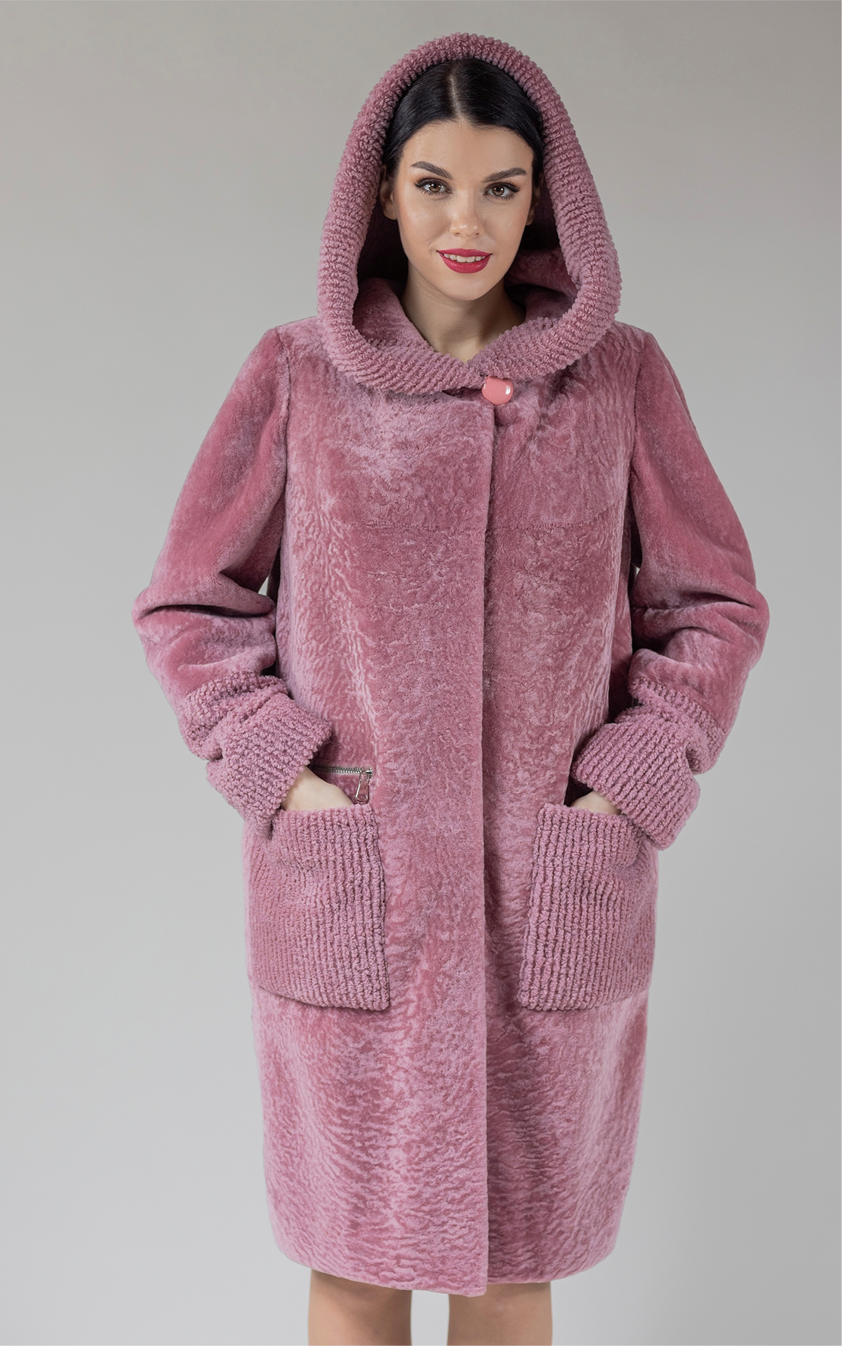 Полупальто с капюшоном из овчины с эффектом керли, классическая модель в современном звучании. О-образный, чуть зауженный книзу силуэт полупальто, плоский завиток керли, крой цельными пластинами — все это элементы классики зимнего гардероба. Пикантные нотки придает изделию выраженный ребристый рисунок, полученный путем особой обработки овчины. Фактурные ребристые вставки отчетливо выделяются в отделке капюшона и рукавов. Еще один необычный акцент — застежки-молнии рядом с накладными карманами. Яркий розовый цвет выделяет вас из множества оттенков серого в городском потоке людей. Вы можете не заботиться ни о головном уборе, ни о дополнительных украшениях — шуба «Селена» объединила в себе все, что нужно в промозглое межсезонье или европейской зимой.Характеристики